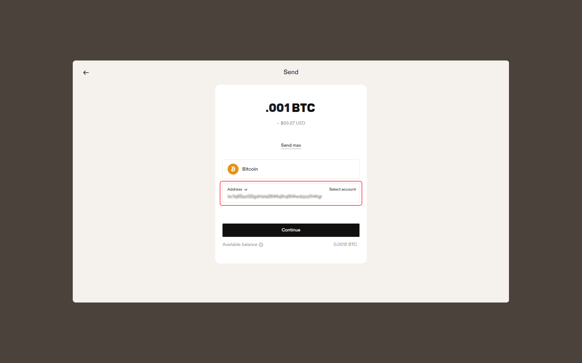 3. Enter Transaction DetailsAmount: Specify how much BTC you want to send.Recipient’s Address: Paste or type the Bitcoin address you wish to send to. Double-check the address carefully to avoid errors. Whenever possible, paste the address.Press Continue when you’re ready.