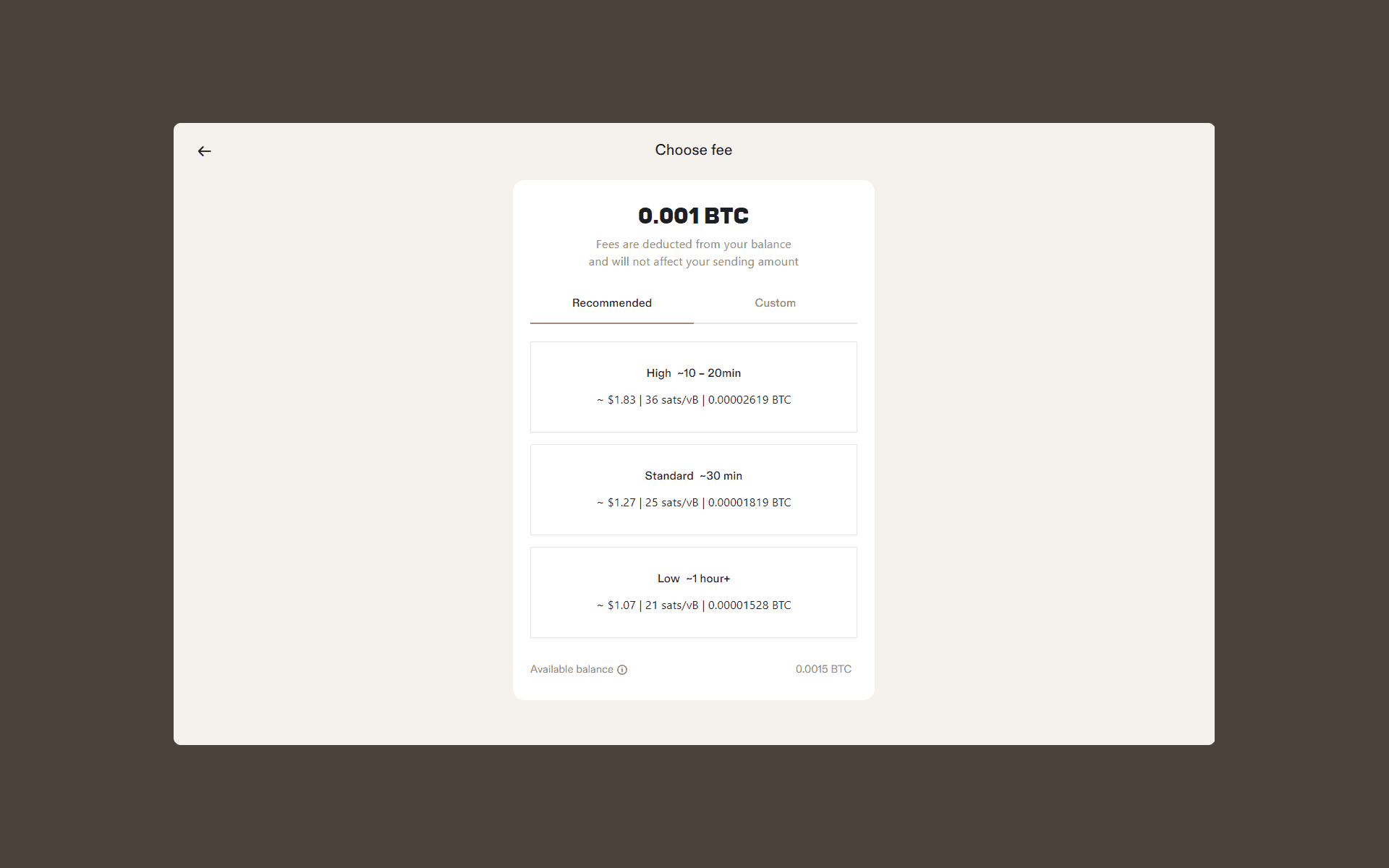4. Choose Your Fee: Leather gives you control over the transaction fee.Standard Fee: A balanced option for most transactions.Priority Fee: Opt for a higher fee if you want faster confirmation.Custom Fee: For advanced users who want to set a precise fee.