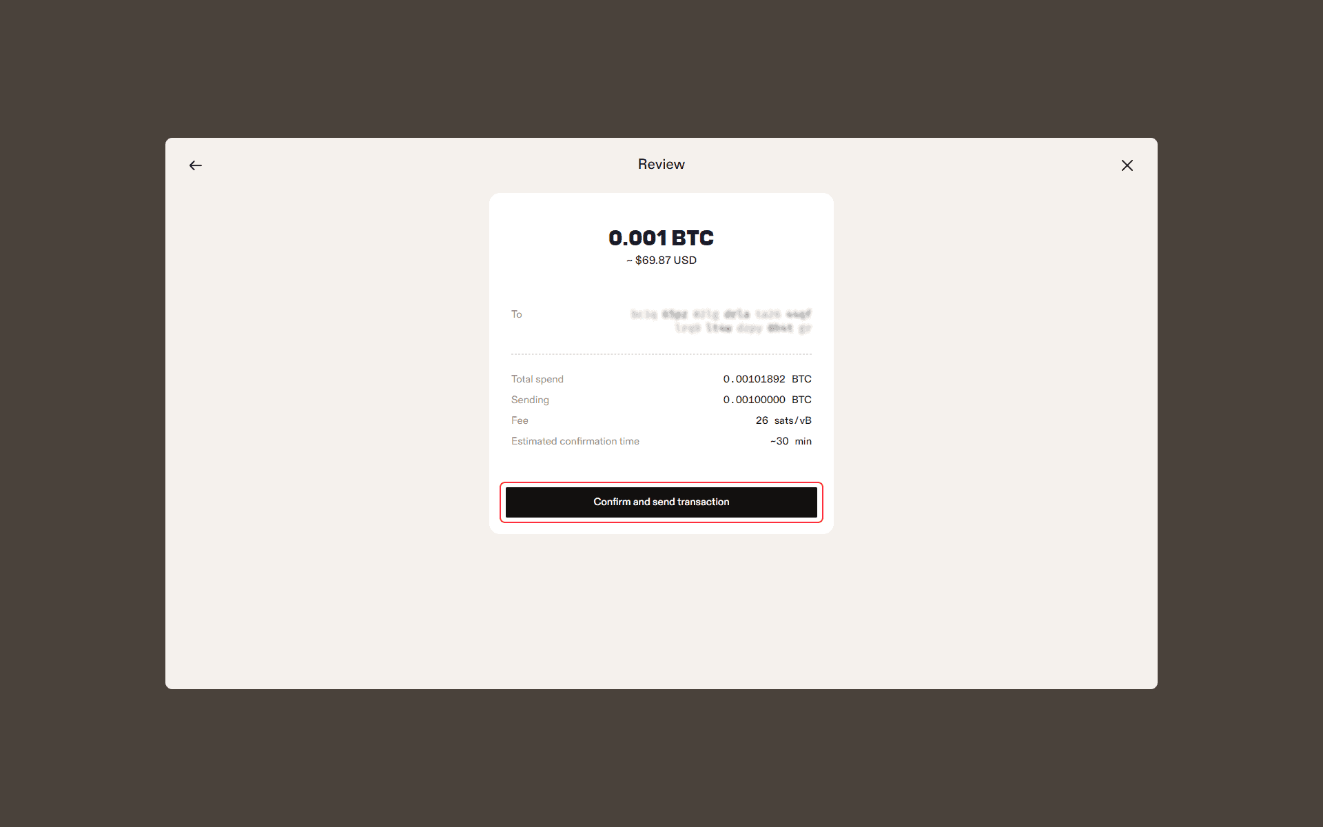 5. Review and Confirm: Before finalizing your transaction, carefully review the Recipient’s Address, BTC Amount, and Selected Fee.
